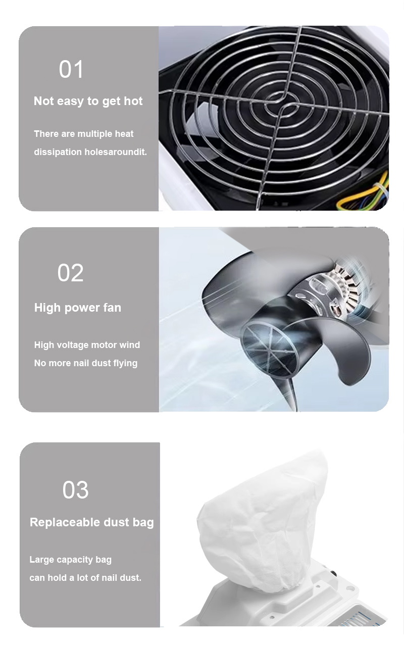 Ndiyo. TheKikusanya vumbi la Kucha Iliyopachikwa kwenye Eneo-kazi imeundwa mahsusi kwa kutovuja kwa vumbi. Nguvu kubwa ya kufyonza ya 45W, ikiunganishwa na kuziba kwa ufanisi karibu na eneo la kuchukua, huhakikisha kuwa chembechembe za vumbi zimenaswa kwenye chanzo badala ya kutoroka na kurudi kwenye nafasi ya kazi. Wakati wa kuhifadhi faili nzito za akriliki, kitengo hudumisha utendakazi thabiti wa kufyonza, kuweka kaunta safi na kuzuia vumbi kupeperuka hewani. Kwa mafundi wanaofanya huduma nyingi za akriliki kila siku, ukamataji huu unaotegemewa wa vumbi hupunguza kwa kiasi kikubwa mfiduo wa vumbi unaoongezeka.