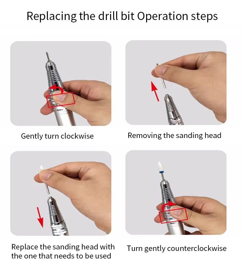 Njia hii ya kuchimba misumari inayoshikiliwa kwa mkono na uwekaji wa polisher, ambayo ni, kuziba na kuvuta nje, rahisi na rahisi, uingizwaji unaweza kutumika baada ya kukamilika.