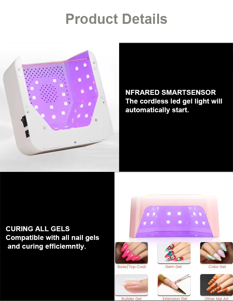 Taa hii ya ubora wa juu ya rangi ya msumari ya gel inahakikisha hata kukausha gundi bila kupungua. Vyanzo vyake viwili vya mwanga hutoa joto laini ili kuzuia kubadilika rangi kwa mikono na mkazo wa macho, vinavyofaa kwa mikono na miguu yote miwili, hivyo kutoa matokeo ya kukauka haraka sana.