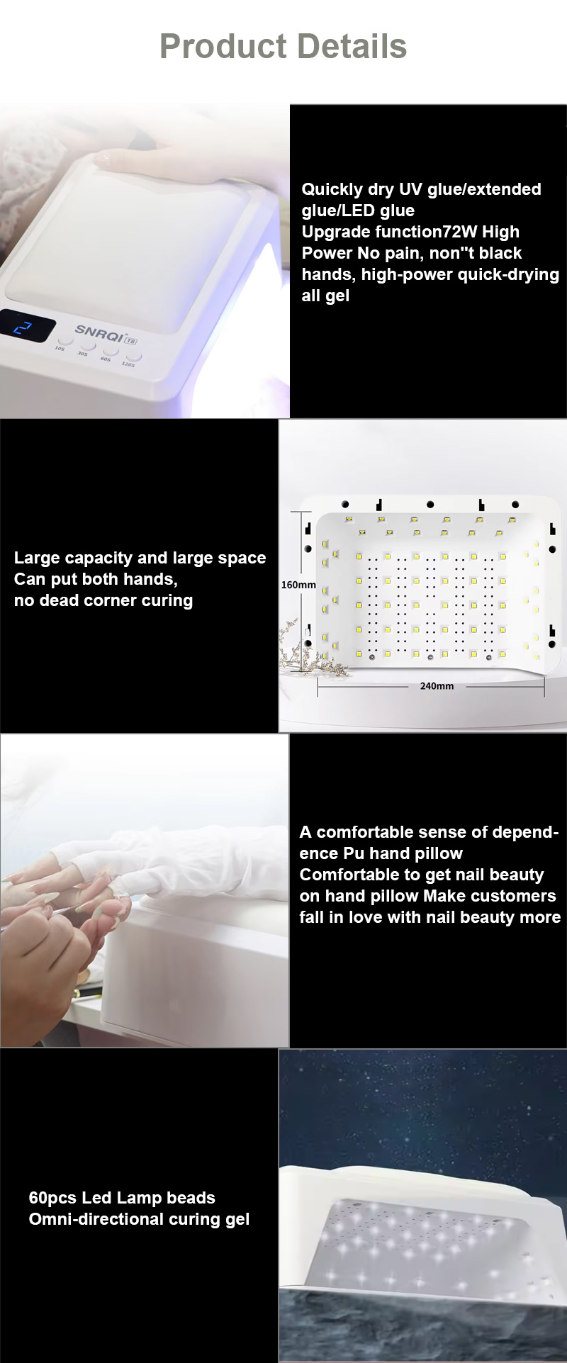 Bidhaa hiyo inahakikisha hata kukausha gundi bila kupungua. Vyanzo vyake viwili vya mwanga hutoa joto laini ili kuzuia kubadilika rangi kwa mikono na mkazo wa macho, vinavyofaa kwa mikono na miguu yote miwili, hivyo kutoa matokeo ya kukauka haraka sana.