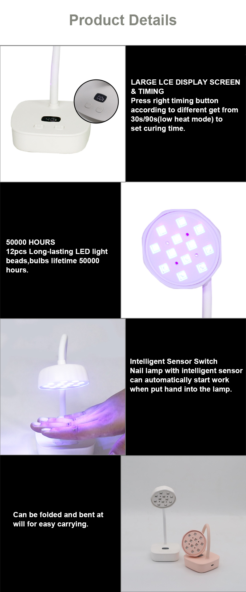 Bidhaa inahakikisha hata kukausha gundi bila shrinkage. Vyanzo vyake viwili vya taa hutoa inapokanzwa upole kuzuia kubadilika kwa mikono na shida ya jicho, inayofaa kwa mikono na miguu, ikitoa matokeo ya kukausha haraka.