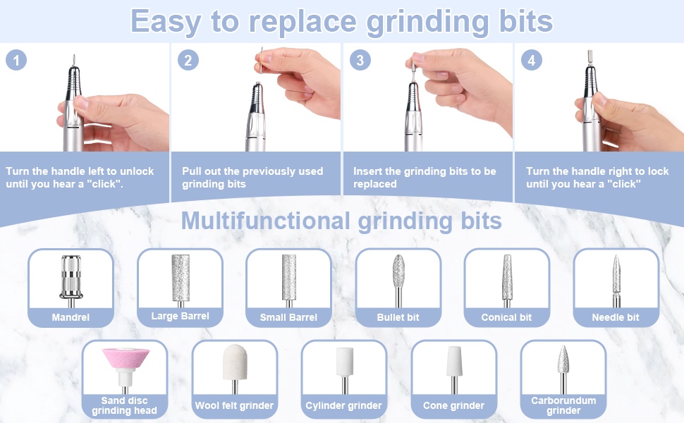 Seti hii ya kuchimba kucha yenye kelele ya chini ina rangi 2 za kuchagua, nyeusi/nyeupe/kijivu/bluu/nyekundu/pinki/chungwa, rangi za rangi.