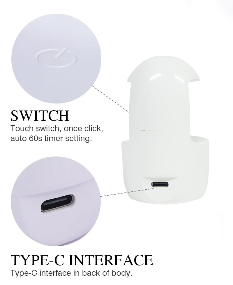 Taa ya Msumari wa Kidole Kimoja huhakikisha hata kukausha gundi bila kupungua. Vyanzo vyake viwili vya mwanga hutoa joto laini ili kuzuia kubadilika rangi kwa mikono na mkazo wa macho, vinavyofaa kwa mikono na miguu yote miwili, hivyo kutoa matokeo ya kukauka haraka sana.