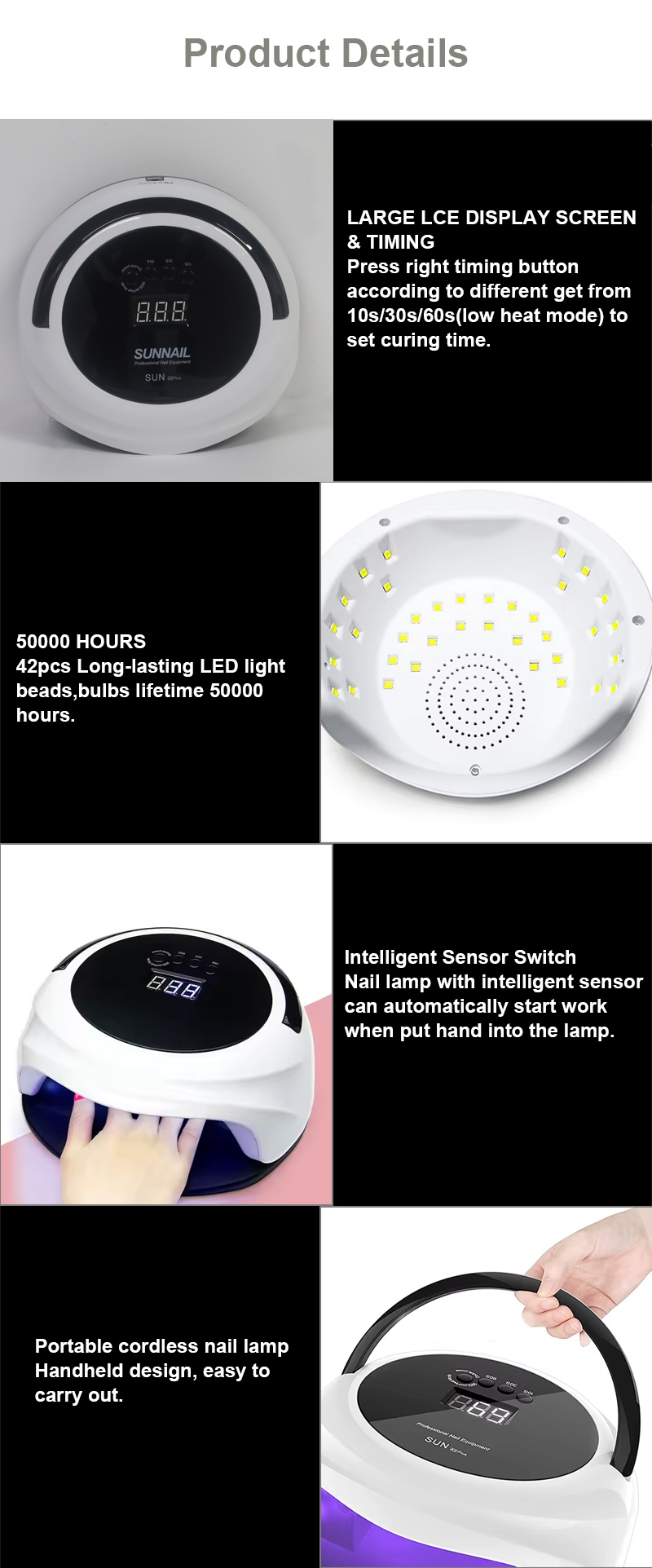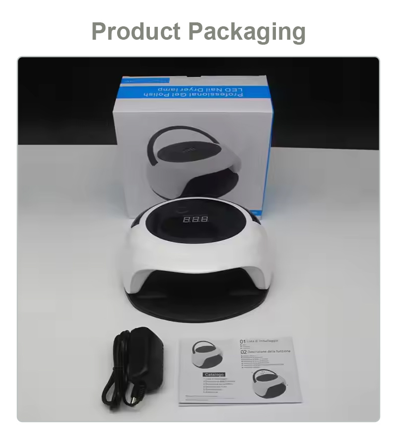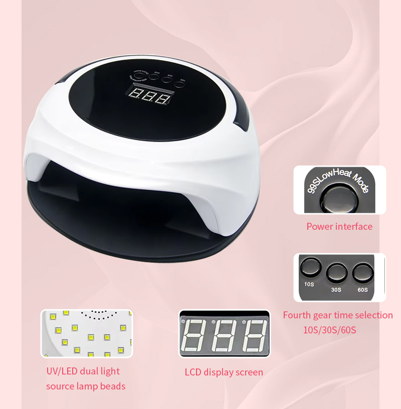 Taa ya kukaushia kucha yenye utendaji wa kihisi otomatiki huangazia teknolojia ya kutambua mahiri ya infrared ambayo humulika kiotomatiki mikono inapokaribia na kuzima wakati mikono inaposogea—huondoa usumbufu wa kubonyeza vitufe mara kwa mara na kuokoa muda na juhudi. Gundi ya kuoka yenye nguvu ya juu hauhitaji kusubiri kwa muda mrefu, kuokoa muda na jitihada.