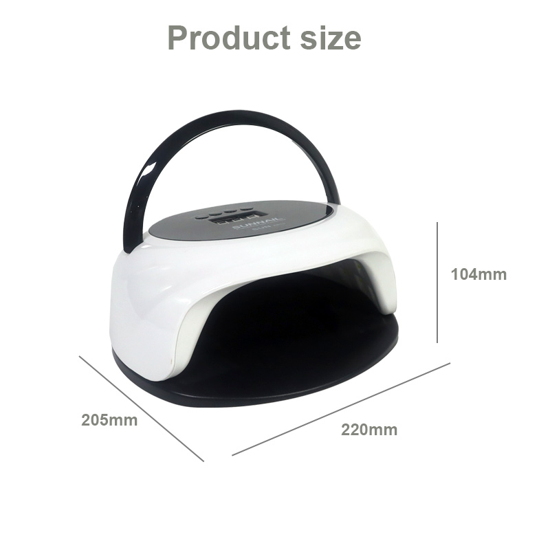 Vipimo vya taa ya kukausha msumari na kazi ya sensor moja kwa moja ni urefu wa 205 mm, 220 mm kwa upana na 104mm kwa urefu, na uwezo mkubwa na uwezo wa kutumia mikono na miguu yote, ambayo ni rahisi sana.