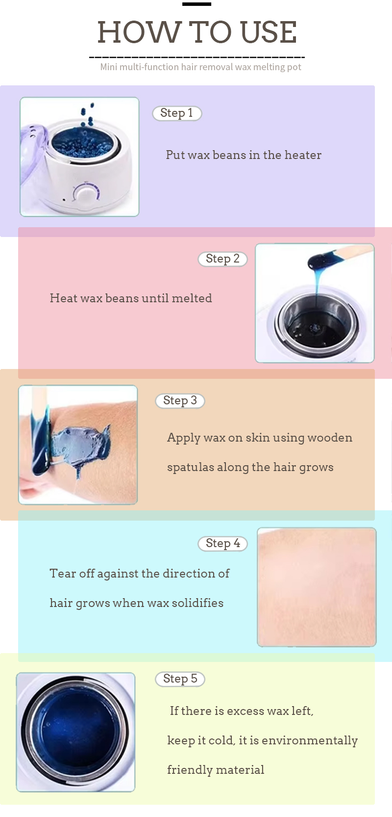 Njia ya uendeshaji wa wax ya bidhaa, hali ya juu ya joto huyeyuka haraka, chini ya joto polepole kuyeyuka, kumwaga kwanza kwa kiwango kinachofaa cha maharagwe ya nta, inapokanzwa hadi maharagwe ya nta yakayeyuka, kisha sehemu za ukuaji wa nta zilizowekwa sawa, na mwishowe dhidi ya mwelekeo wa ukuaji wa nywele.