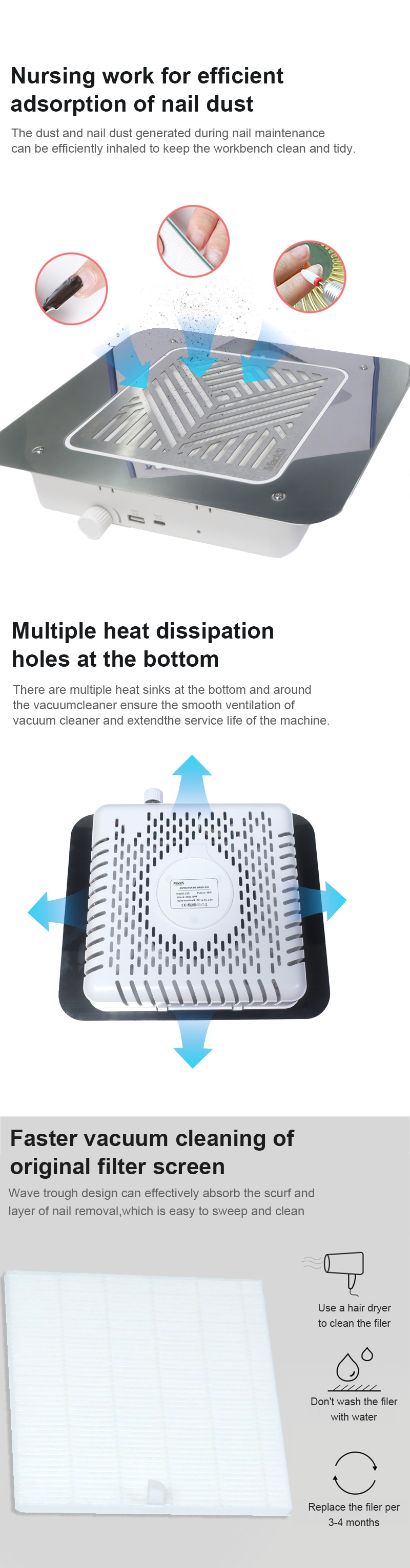Bidhaa Adsorption yenye nguvu ya uchafu wa msumari haitoi vumbi, kuweka laini ya juu na safi, utupu wa haraka hauvuja nguvu ya vumbi yenye ufanisi zaidi.