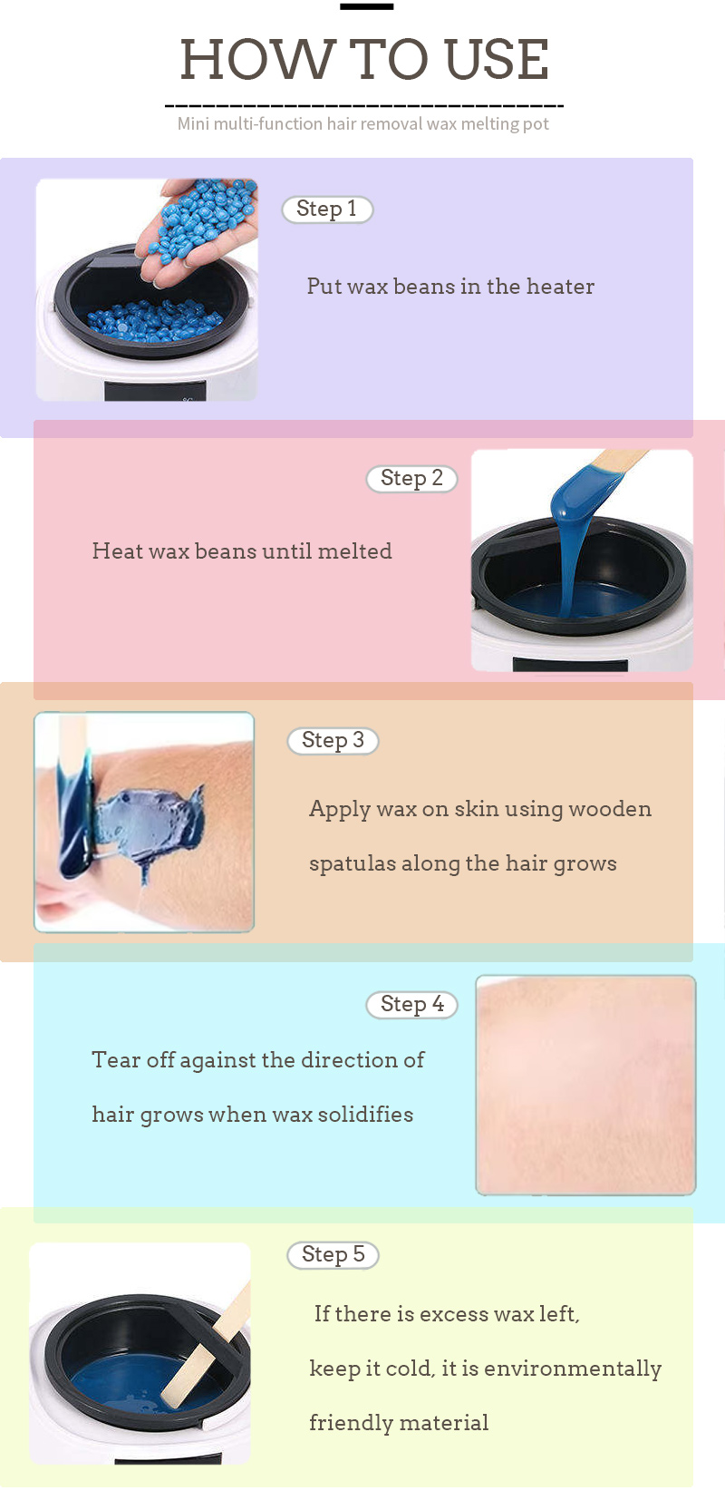 Njia ya uendeshaji wa wax ya bidhaa, hali ya juu ya joto huyeyuka haraka, chini ya joto polepole kuyeyuka, kumwaga kwanza kwa kiwango kinachofaa cha maharagwe ya nta, inapokanzwa hadi maharagwe ya nta yakayeyuka, kisha sehemu za ukuaji wa nta zilizowekwa sawa, na mwishowe dhidi ya mwelekeo wa ukuaji wa nywele.