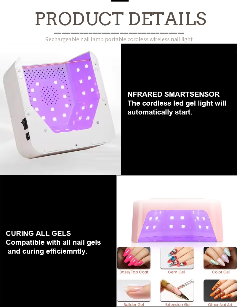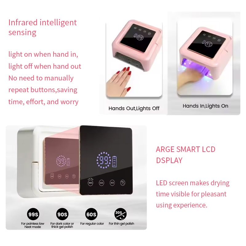 Taa ya mraba ya kukaushia kucha ina teknolojia ya kutambua mahiri ya infrared ambayo humulika kiotomatiki mikono inapokaribia na kuzima wakati mikono inaposogea—huondoa usumbufu wa kubonyeza vitufe mara kwa mara na kuokoa muda na juhudi. Gundi ya kuoka yenye nguvu ya juu hauhitaji kusubiri kwa muda mrefu, kuokoa muda na jitihada.
